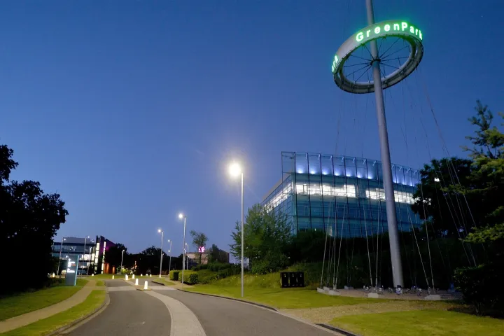 We chose the Schréder Ampera as it fits perfectly with the hightech surroundings of Green Park. It is a modern, slimline luminaire that offers a good aesthetic appeal during the day and excellent lighting levels and uniformity at night.